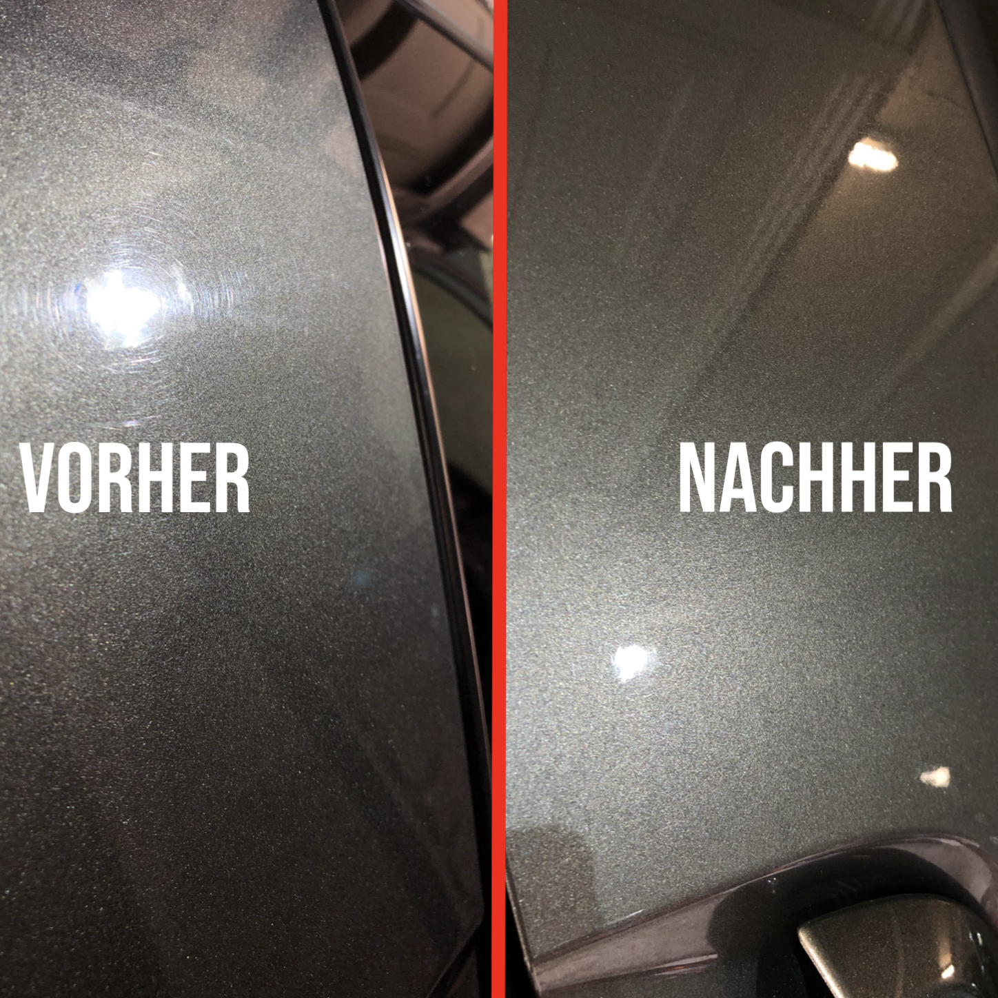 Unser Lastesel konnte seine ländliche Herkunft nicht verstecken, gealterter Lack, allerhand Gerüche und Dreck im Innenraum, technisch war er aber gut durchgewartet. Drei Poliermaschinen-Fahrten war schon nötig, um eine brauchbare Basis zuerreichen – innen haben wir einen extra Tag investiert. Zum Dauerhaften Schutz und einfachen Reinigen kam eine Servfaces Keramik Versieglung zum Einsatz.