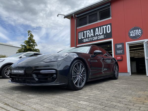 Dieser Porsche Panamera 4s kam in einem ordentlichen Zustand zu uns. Die Waschstraßen Schäden sollten sich aber sehr bald als wesentlich erheblicher darstellen, als zunächst zu vermuten war. Der Wagen bekam neben Handwäsche und Lackknete zunächst einen medium Exzenter Schliff, was eigentlich hätte ausreichen müssen, um den Kratzern ans Leder zu gehen. Der Lack stellte sich aber – ungewöhnlich für Porsche – sehr hart und geduldig dar, worauf hin wir eine gröbere Gangart wählen mussten. Hartes Pad, Blue Cut und Rotationsschleifer waren dann in der Lage, den Großteil der Schäden zu beseitigen. Durch den groben Cut mussten wir natürlich eine extra Runde finish Politur fahren, um keine Hologramme und sonstige Spuren zurück zu behalten – ebenfalls rotativ. Ein kompletter Extra-Tag musste aufgewendet werden.